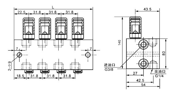 該型分配器適用于公稱壓力為40MPa的雙線式干油集中潤(rùn)滑系統(tǒng)中,在兩條供油主管交替的供油壓力作用下,直接由供油壓力控制活塞動(dòng)作給油,完成向潤(rùn)滑點(diǎn)定量分配潤(rùn)滑脂的功能。