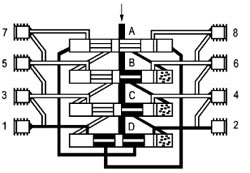這時活塞B至D從左側(cè)向右側(cè)運動,按以上相反方向順序動作完成一個周期循環(huán)并可重新開始一個新的循環(huán)。