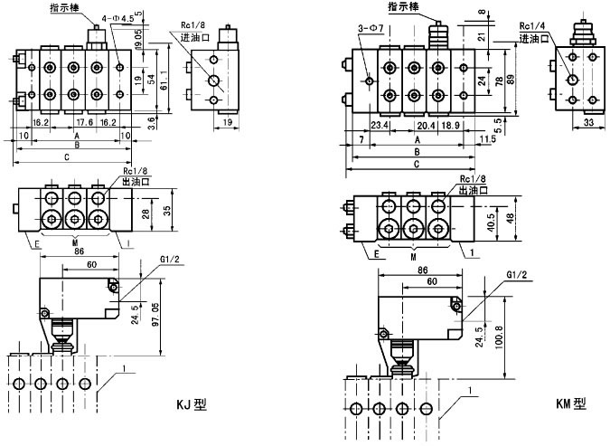 KJ、KM、KL系列單線遞進(jìn)式分配器,它由中碳合金結(jié)構(gòu)鋼制造的供給體、端部體和3~8片根據(jù)設(shè)計(jì)需要所確定的給油量和出油口數(shù)的中間體組合而成。分配器的正常出口設(shè)置于分配器的兩側(cè)面,在上面還設(shè)置有預(yù)備出口,各中間體的出油口內(nèi)均裝有止回閥,能徹底防止因潤滑點(diǎn)背壓作用而產(chǎn)生潤滑脂的逆流,保證了各出油口的給油量定量、準(zhǔn)確。