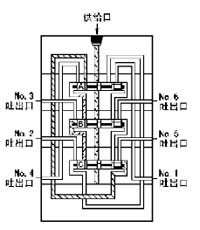 6、流入的潤滑劑推動活塞B向右運(yùn)動、右腔的潤滑劑壓向NO.5吐出口,經(jīng)外部配管送向潤滑點(diǎn)。當(dāng)活塞B移動到至右極限時(shí)活塞A左腔開始進(jìn)入潤滑劑。