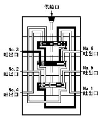5、流入的潤滑劑推動活塞C向右移動、右腔的潤滑劑壓向NO.4吐出口經(jīng)外部配管送向潤滑點(diǎn)。當(dāng)活塞C運(yùn)動至右極限時(shí)活塞B左腔開始進(jìn)入潤滑劑。