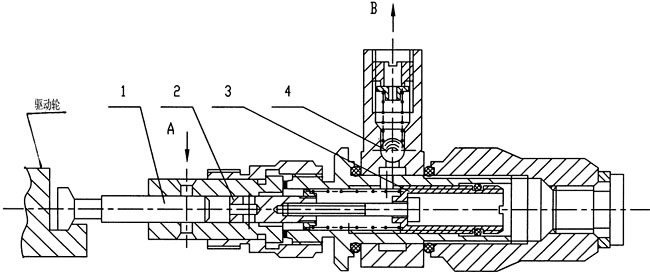 1—工作活塞 2—控制活塞 3—調(diào)節(jié)螺套 4—單向閥 |