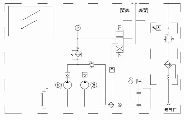 該站主要由油箱(帶電加熱器、液位計、電接點溫度計、空氣濾清器、液位控制器)、兩臺高壓油泵裝置(一備一用)、溢流閥、電磁閥、過濾器、壓力控制器以及氣動三聯(lián)件和PLC電氣控制柜等組成。在電動機的牽引下油泵工作,從油箱內吸入潤滑油加壓排出,途徑單向閥、過濾器和三位四通電磁閥后向雙線系統(tǒng)管線供送。正常工作時,一臺高壓油泵常開工作,另一臺備用,可通過電氣轉換開關來選擇使用,并可通過按鈕開關人工啟動和停止油泵。PLC電氣控制箱對油氣系統(tǒng)實行程序化全自動控制,還可向主控室提供系統(tǒng)“運行”、“停止”、“故障”等遠程信號接口。